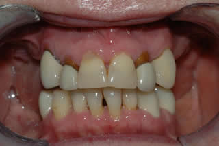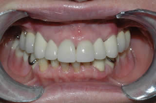 The patient only has six upper teeth. Four of the six teeth have traditional crowns that show black metal margins over time.